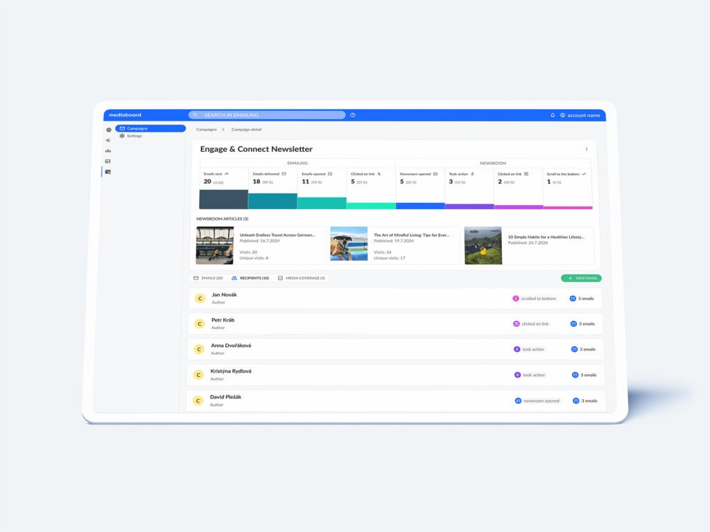 Součástí nové služby je také pokročilá analytika a komplexní vyhodnocení kampaní. Monitoring médií umožňuje automatické přiřazování článků k originální tiskové zprávě vložené do newsroomu a trackování jejich výtěžnosti. Díky rozesílání e-mailů přímo přes platformu Mediaboard Connect může navíc uživatel analyzovat i reakce každého příjemce a zjistit, jestli si e-mail otevřel, jestli se proklikl na newsroom nebo například jak pracoval s dostupnými přílohami.